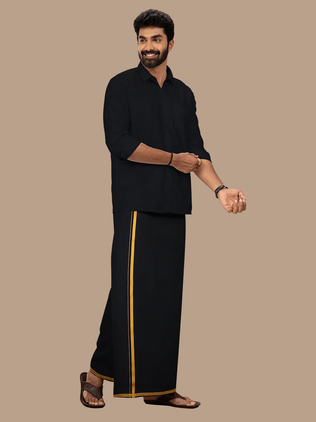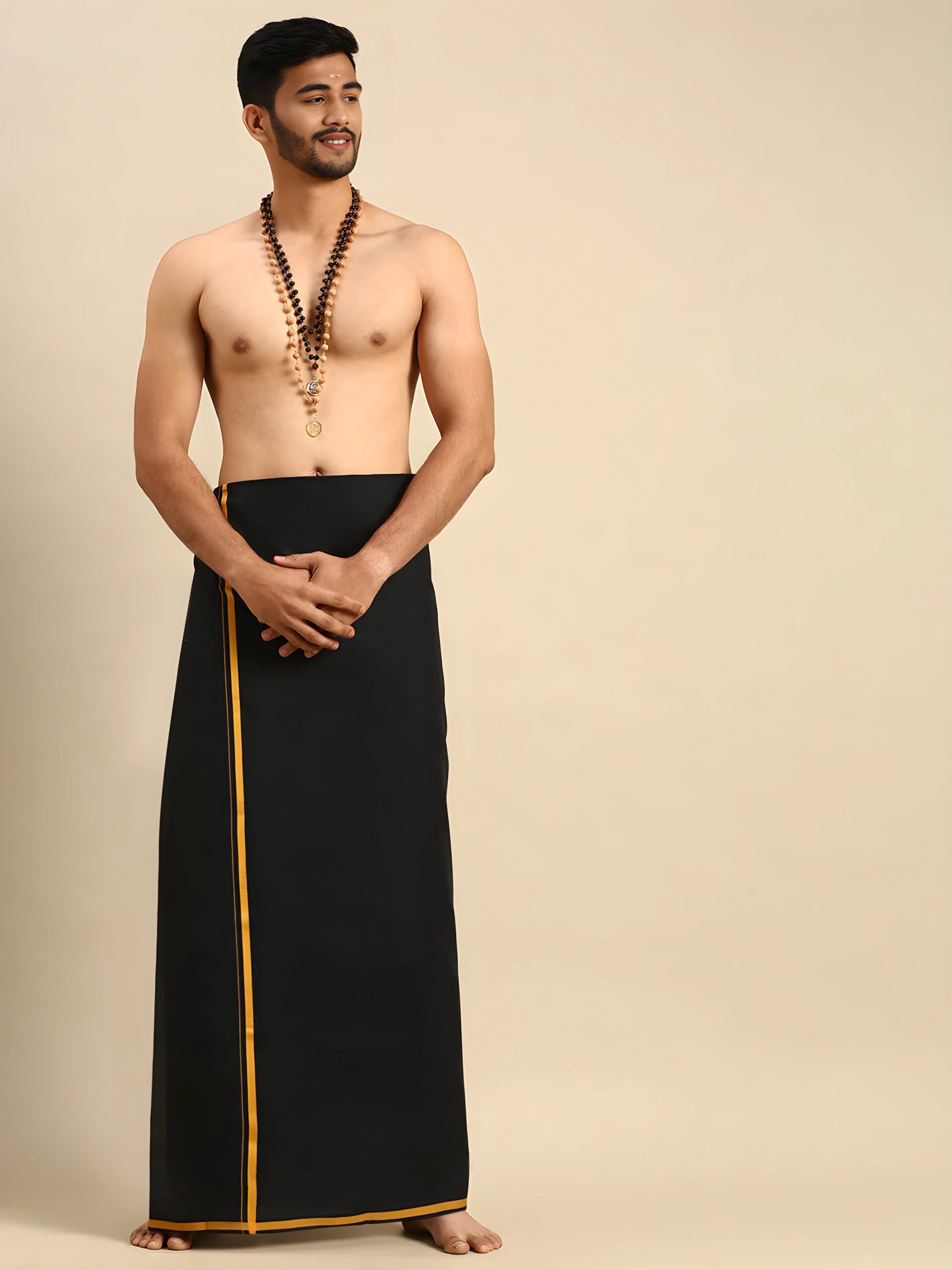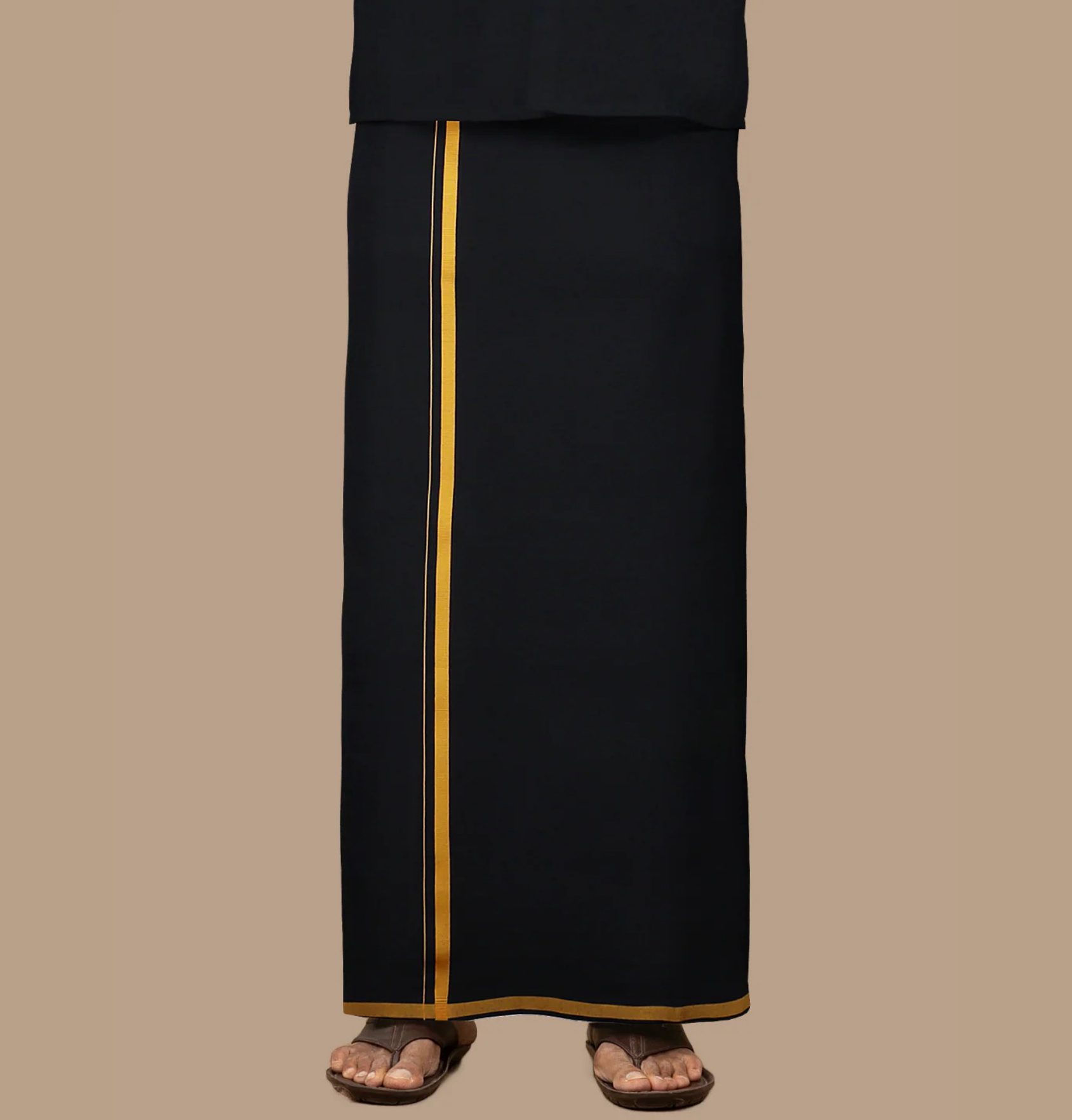 Premium Men 100% Cotton Single Layer Black 3/4″ Gold Jari Border South Indian Dhoti | Tamil Lungi